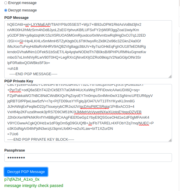 Session completed. Using an online PGP decrypter we are able to find the password for root using the previously discovered pgp message in root.pass, private key in .keys, and the password blink182.