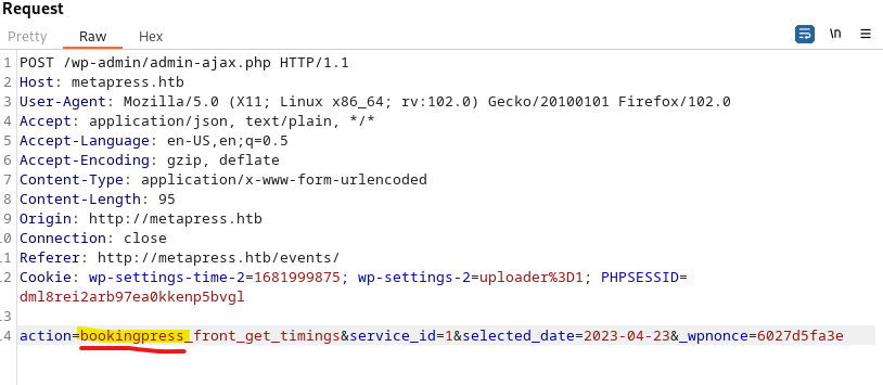 Navigating to events we create an event and look at the traffic through burp. Looking at the post data we see the wordpress plugin BookingPress is being used.